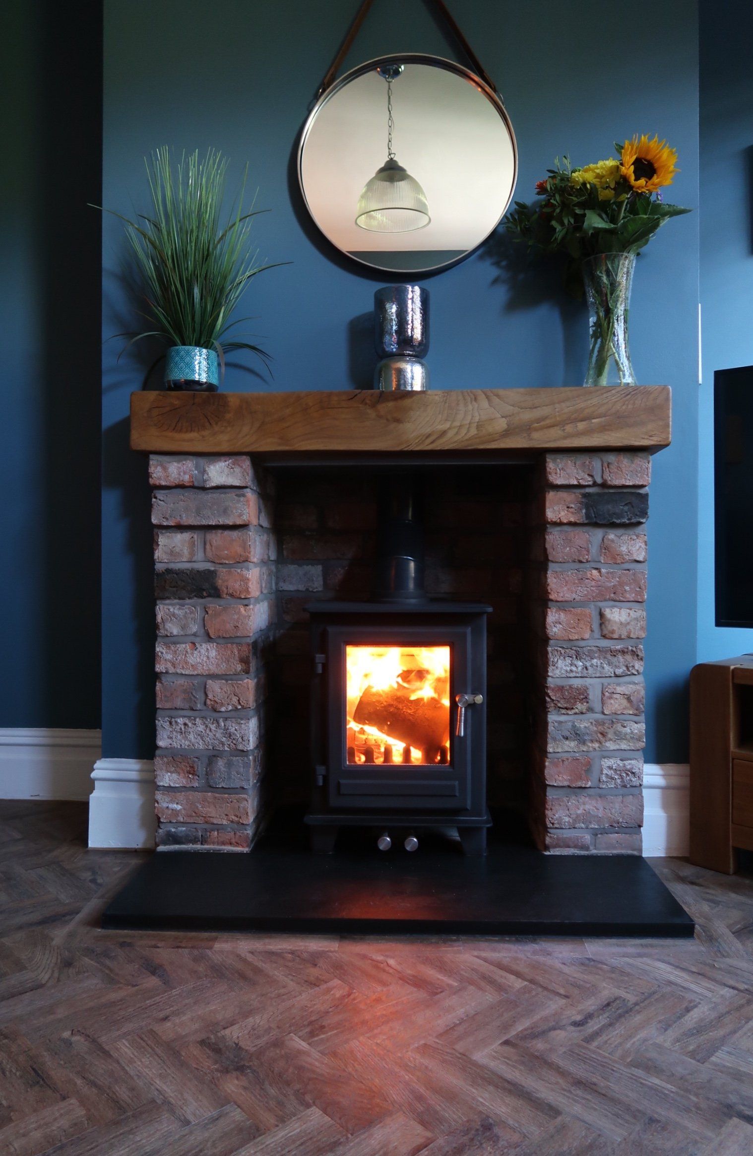 Chamber walls are lined with a flame resistant fireboard. Once painted with emulsion leaves a clean and modern appearance. This type of Installation is popular as the hearth and stove acts as the focal point to the room.